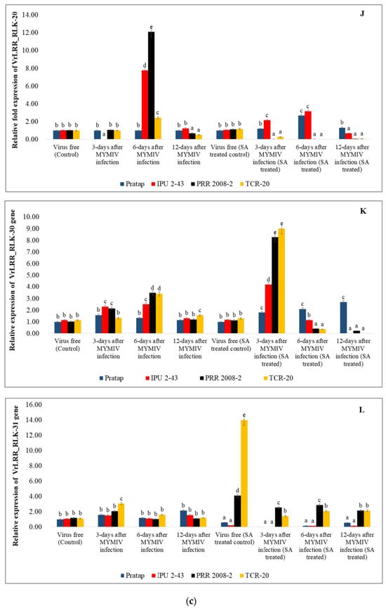 (a) qRT-PCR analysis of LRR candidate genes (A) VrNBS_CNLRR-1; (B) VrNBS_CNLRR-4; (C) VrNBS_NLRRcc-5; (D) VrNBS_TNLRR-8; (E) VrNBS_NLRRtir-11 under control and MYMIV infection in untreated and SA-treated genotypes. (b) qRT-PCR analysis of LRR-RLK candidate genes (F) VrLRR_RLK-16; (G) VrLRR_RLK-17; (H) VrLRR_RLK-18; (I) VrLRR_RLK-19 under control and MYMIV infection in untreated and SA-treated genotypes. (c) qRT-PCR analysis of LRR-RLK candidate genes (J) VrLRR_RLK-20; (K) VrLRR_RLK-21; (L) VrLRR_RLK-31 under control and MYMIV infection in untreated and SA-treated genotypes. The different letters in the graph showed significant differences among them.