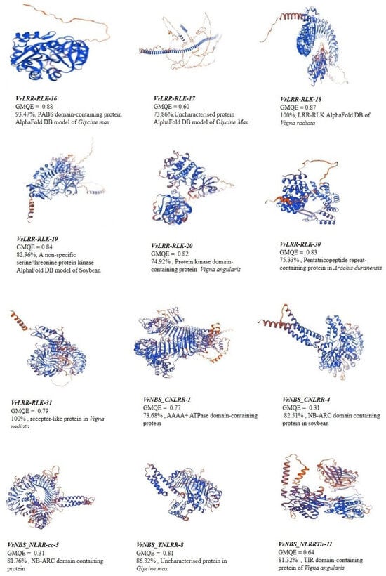 Gene sequences encoding PABS domain-containing proteins were analyzed using Alpha Fold DB to model their structures, providing insights into sequence identity, organism origin, oligomeric state, and GMQE (Global Model Quality Estimation) scores (Figure 7, Table S1). VrLRR_RLK-16 showed a 93.18% sequence identity with Glycine max (soybean), with a monomeric form and a high GMQE score of 0.88. A second model for this gene, Thermospermine Synthase (MtTSPS), exhibited 91.9% identity with Medicago truncatula, with a GMQE of 0.81. VrLRR_RLK-17 matched an uncharacterized protein from Glycine max at 72.62% identity and a GMQE of 0.60. VrLRR_RLK-18 demonstrated 100% identity with a probable LRR receptor-like protein kinase from Vigna radiata var. radiata and had a GMQE of 0.87. VrLRR_RLK-19, another LRR-RLK, showed 81.96% identity to a non-specific serine/threonine protein kinase from Glycine max, with a GMQE of 0.84. VrLRR_RLK-30 was aligned with a pentatricopeptide repeat-containing protein from Arachis duranensis at 75% identity and a GMQE of 0.83. VrLRR_RLK-31 showed 100% identity to a receptor-like protein isoform X1 from Vigna radiata var. radiata, with a GMQE of 0.79. For NBS-LRR proteins, VrNBS_CNLRR-1 exhibited 72.3% identity with an AAA+ ATPase domain-containing protein from Glycine max and a GMQE of 0.69. VrNBS_CNLRR-4 matched a TIR domain-containing protein from Glycine max at 79.02% identity and a GMQE of 79.05%. Finally, VrNBS_NLRRtir-11 had 82.51% identity with an NB-ARC domain-containing protein from Glycine max and a GMQE of 0.76.