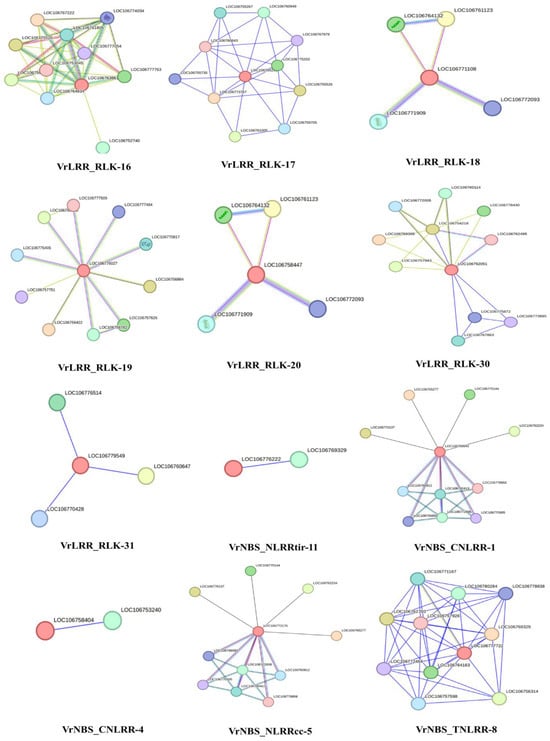 Protein–protein interactions for all the selected genes were predicted using the string database (Figure 8, Table S2). The protein–protein interaction analysis of Vigna radiata LRR and NLR gene families revealed various key interacting partners. The protein VrLRR_RLK-16 showed interactions with multiple S-adenosylmethionine decarboxylase proenzymes, such as LOC106767222, LOC106775526, LOC106759397, and LOC106777763, each with a high interaction score of 0.837 or 0.831. Additionally, interactions were observed with proteins involved in root development (LOC106752740) and various decarboxylases, including ornithine (LOC106761805) and glutamate (LOC106764834) decarboxylases, with scores above 0.780. VrLRR_RLK-17 interacted with several uncharacterized proteins (e.g., LOC106773767, LOC106775202) and a pectinesterase inhibitor, albeit with lower interaction scores ranging between 0.502 and 0.468. Similarly, VrLRR_RLK-18 interacted with proteins like BRI1 kinase inhibitors (LOC106761123, LOC106764132) and somatic embryogenesis receptor kinases, although the scores for these interactions were modest, around 0.446. VrLRR_RLK-19 showed interactions with transcription factors, such as Myb-related protein 305-like (LOC106756422), transcription factor JAMYB-like (LOC106756984), and calcium-binding proteins, including calmodulin-3 (LOC106757626) and calmodulin-like protein 11 (LOC106770817), with interaction scores between 0.579 and 0.567. Furthermore, VrLRR_RLK-30 and VrLRR_RLK-31 interacted with proteins involved in biosynthesis and stress response, such as phosphatidylinositol glycan anchor biosynthesis protein (LOC106769395), kinesin-like proteins, and TMV resistance proteins, with scores ranging from 0.325 to 0.479. In the NBS family, VrNBS_CNLRR-1 and VrNBS_NLRRcc-5 exhibited interactions with sulfate transporters (LOC106765277, LOC106776137) and serine/threonine protein kinases (LOC106760912, LOC106766693) with interaction scores around 0.237 and 0.200. Lastly, VrNBS_TNLRR-8 and VrNBS_NLRRtir-11 displayed interactions with proteins like WVD2-like 4 isoform X1 and F-box/LRR-repeat proteins, with scores between 0.330 and 0.412. These interactions provide valuable insights into the functional roles of these proteins in stress response, development, and metabolic regulation in Vigna radiata. Thus, the protein–protein interaction analysis of Vigna radiata LRR and NLR gene families highlights significant interactions with proteins involved in various biological processes, such as decarboxylation, kinase activity, calcium binding, and sulfate transport. VrLRR_RLK proteins exhibited strong interactions with S-adenosylmethionine decarboxylase proenzymes, root meristem growth factors, and BRI1 kinase inhibitors, indicating their role in developmental and stress response pathways. Similarly, VrNBS proteins interacted with key components like sulfate transporters and serine/threonine kinases, suggesting their involvement in regulatory and stress mechanisms. The diverse range of interactions underscores the functional complexity of LRR and NLR proteins in Vigna radiata, with implications for understanding stress tolerance, growth, and metabolic regulation.