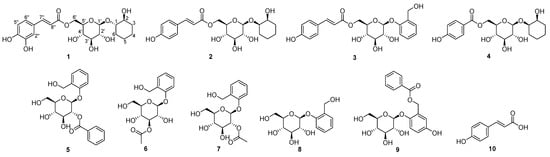 The twigs of S. koreensis were extracted with 80% ethanol, producing an ethanol (EtOH) extract that was subsequently fractionated by solvent partitioning into n-hexane-, dichloromethane (CH2Cl2)-, ethyl acetate (EtOAc)-, and n-butanol (n-BuOH)-soluble fractions. The EtOAc fraction was selected for detailed study due to its rich content of phenolic glycosides, as identified through LC/MS and HR-LC/MS analyses. This fraction underwent extensive phytochemical investigation, involving repeated column chromatography and both preparative and semi-preparative HPLC. These purification steps resulted in the isolation of a new phenolic glycoside (1) along with nine known phenolic compounds (2–10), as depicted in Figure 1.