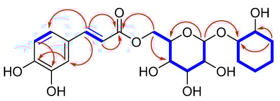 The planar structure of compound 1 was elucidated through 2D NMR spectroscopy analysis, specifically utilizing COSY and HMBC experiments. These techniques provided detailed insights into the connectivity and arrangement of the atoms within the molecule, enabling the construction of the molecular framework illustrated in Figure 2. The HMBC correlations between H-2″/C-4″, H-5″/C-3″, and H-7″/C-2″ and C-6″ confirmed the presence of a 1,3,4-trisubstituted aromatic ring. Further analysis of the HMBC and 1H-1H COSY spectra revealed that the complete planar structure of compound 1 shares the same sugar moiety connectivity (glucose) and 1,2-cyclohexanediol unit as those found in isograndidentatin B (2). These structural similarities were detailed and corroborated using the spectral data, as illustrated in Figure 2. To confirm the sugar unit, β-glucosidase (1 mg, almonds, Sigma-Aldrich) was utilized for the enzymatic hydrolysis of 1. The subsequent enzymatic hydrolysis gave D-glucopyranose, which was confirmed by LC/MS analysis [18,19]. Finally, the coupling constant of the anomeric proton at δH 4.42 (J = 8.0) confirmed the sugar to be β-D-glucopyranose.