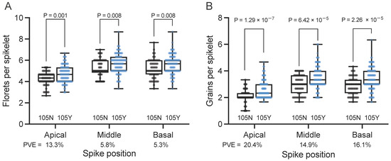 Phenotypic effects of the GNI-A1 alleles on spikelet morphology in the NBRP collection. (A) Number of florets per spikelet after harvesting. (B) Number of grains per spikelet. The number of florets/grains per spikelet was determined from the apical, middle, and basal parts of the spike. Black indicates cultivars carrying the 105N allele (n = 57; Triticum aestivum: 41 accessions, macha: 4, and spelta: 12) and blue indicates cultivars carrying the 105Y allele (n = 112; aestivum: 104, compactum: 3, spelta: 1, sphaerococcum: 2, vavilovii: 2, and synthetic wheat: 1). P values were determined using the Student’s t-test. PVE: phenotypic variance explained by GNI-A1 alleles.
