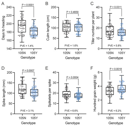 Agronomic traits of members of the NBRP core collection with the 105N or 105Y allele. (A) Days to heading, (B) Culm length, (C) Number of tillers per plant, (D) Spike length, (E) Number of spikelets per spike, (F) Hundred-grain weight. Cultivars carrying the 105N allele include 57 accessions (Triticum aestivum: 41 accessions, macha: 4, and spelta: 12) and cultivars carrying the 105Y allele include 112 accessions (aestivum: 104, compactum: 3, spelta: 1, sphaerococcum: 2, vavilovii: 2, and synthetic wheat: 1), respectively. P values were determined using the Student’s t-test.