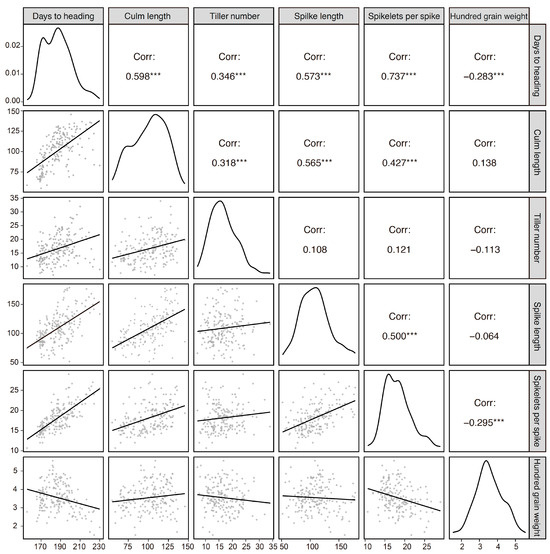 Correlations between agricultural traits. The phenotypic data were obtained from the NBRP panel (n = 188; Triticum aestivum: 159 accessions, compactum: 6, macha: 4, spelta: 13, sphaerococcum: 2, vavilovii: 2, and synthetic wheat: 1). Asterisks indicate significant correlations at p < 0.001 (***).