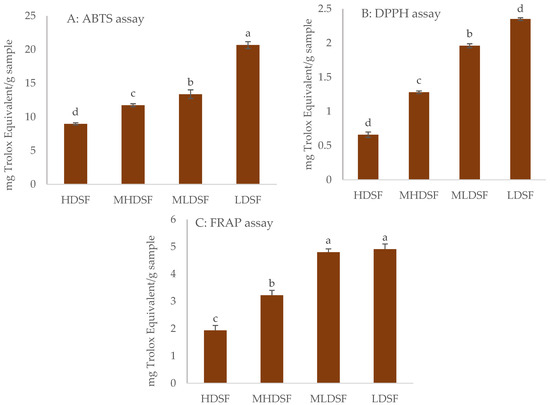 Effect of particle size on antioxidant properties ((A): ABTS assay; (B): DPPH assay; (C): FRAP assay) of date seed flour cv. Medjool cultivated on the Elche palm grove. HDSF: highest date seed flour (1.16 mm < Ø > 0.70 mm); MHDSF: medium-high date seed flour (0.70 mm < Ø > 0.42 mm); MLDSF: medium-low date seed flour (0.42 mm < Ø > 0.21 mm); and LDSF: lowest date seed flour (Ø < 0.21 mm). For each antioxidant assay, histograms with different superscripts indicate significant differences (p < 0.05) according to Tukey’s multiple range test.