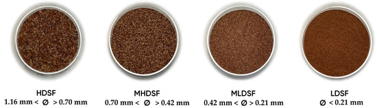 The dates (cv. Medjool) without adequate commercial size, free from damage and infections, were obtained from the Elche palm groove. The seeds were manually separated from the pulp and dried for 48 h at 55 °C. Subsequently, they were ground and passed through different sieves to obtain four date seed flours with diverse particle sizes: HDSF, highest date seed flour (1160 mm < Ø > 0.70 mm); MHDSF, medium-high date seed flour (0.70 mm < Ø > 0.42 mm); MLDSF, medium-low date seed flour (0.42 mm < Ø > 0.21 mm); and LDSF, lowest date seed flour (Ø < 0.21 mm). Finally, the date seed flours were stored in vacuum packaging until their analysis. Figure 3 shows the different date seed flours obtained.