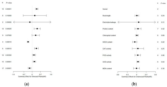 Weighted summary effect sizes (lnR) and 95% CI of the parameters for bZIP overexpression in transgenic plants subjected to drought stress (a) and non-stressed conditions (b). p ≤ 0.05 indicates a significant difference in the moderator level compared to zero; n represents the number corresponding to each summary effect number (same for Figure 2, Figure 3, Figure 4, Figure 5, Figure 6 and Figure 7). The arrow indicates that the upper and lower limits of 95% CI of the parameter exceeds the display range of the graph (same for Figure 2, Figure 3, Figure 4, Figure 5, Figure 6 and Figure 7).