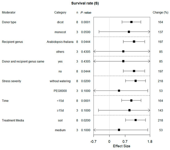 2.3. Subgroup Effect within Each Moderator on Survival Rate in Plants under Drought Conditions