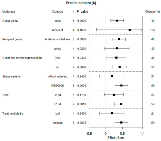2.4. Subgroup Effect within Each Moderator on Proline Content in Plants That Experienced Drought and Non-Stressed Conditions