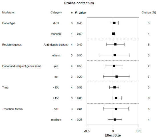 Monocotyledonous plants act as the donor genus, and water deficiency did not affect the proline content under drought conditions at 95% confidence intervals (Figure 3). When plants were cultivated and assessed with PEG6000, the effect of transformation was approximately threefold of that without watering. In contrast to plants grown in soil, transformation had a much larger impact on proline content when the transgenic plants were grown in medium. When the donor and recipient genus were same and the recipient species was Arabidopsis, the proline content of transgenic plants exhibited higher levels compared to the WT plants. The proline content of transgenic plants was significantly increased by 27% and 59% when exposed to drought stress for <15 d and ≥15 d, respectively. However, no difference was found in these moderators under non-stress conditions, and the transgenic plants had almost similar effects on proline levels (Figure 4).