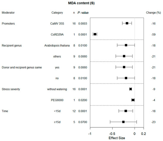 Malondialdehyde is a product of lipid peroxidation reaction. Measurement of MDA content is an indicator to evaluate the extent of oxidative damage to plant cell membranes under drought conditions. Drought-resistant plants can cope with drought-induced oxidative stress and cell membrane damage better, thereby reducing lipid peroxidation in the cell membranes and decreasing the accumulation of MDA accumulation [18]. Yafei Li et al., 2022, studied CsbZIP50-overexpressing plants and found CsbZIP50 exhibited enhanced drought tolerance compared with wild-type plants, as evidenced by higher antioxidant enzyme activities and lower levels of reactive oxygen species (ROS) and MDA content [19]. Other researchers have had similar results [9,11,20,21,22,23]. Based on various individual studies, meta-analysis showed that overexpression of bZIP genes reduced the MDA content level of plants under drought stress. Under normal growth conditions, there was no difference in MDA content between transgenic and wild-type plants. The effect of bZIP overexpression was also influenced by several different regulatory factors (Figure 5). It is worth mentioning that the original percentage of MDA content actually increases when PEG is used to simulate drought stress conditions. Plant roots absorb impurities, such as sodium and phosphorus from PEG, which can affect plant reactions [24]. Hence, holistic consideration should be given to compounds used to simulate drought stress when studying the potential effects of drought stress tolerance levels in genetically modified plants.
