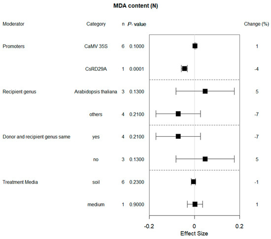 Subgroup analysis of the effects on MDA content of plants under non-stressed conditions. MDA content is evaluated with respect to four moderators, with each moderator level representing a distinct category.