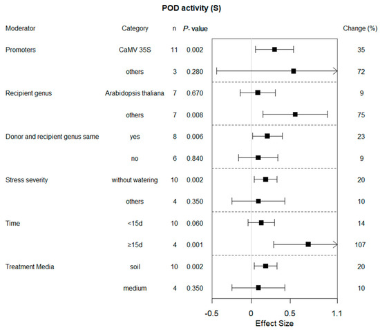 In general, the effect of POD activities in transgenic and WT plants in arid environments was positive, and it was similar under non-stress conditions. This indicates that transgenic plants have stronger stress resistance. SOD and POD activities increased in overexpressed lines in PEG-induced stress than in the WT of Populus [21]. Many researchers have also reached similar conclusions [11,19,20,32]. However, Man Zhang et al., 2020, found that there was a marked decrease in POD and CAT activities in the OX-GmbZIP15 soybean plant compared to WT plants and that GmbZIP15 functions as a negative regulator in response to salt and drought stresses [33].The variations could be attributed to variances in the research subjects and materials employed. Consequently, more studies are required to support this conclusion. The meta-analysis clearly demonstrated that various factors, such as the type of promoter employed, recipient genus and duration of time, significantly impacted POD activity levels of the transgenes in the recipient plants.