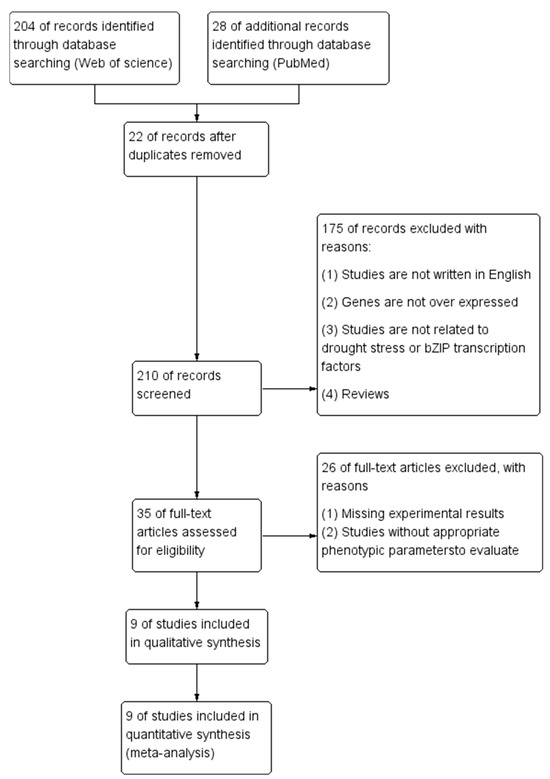Meta-analysis involves statistically combining extensive datasets from numerous studies [6]. It is a systematic statistical approach that provides more statistically significant conclusions and increases understanding of the research question. Meta-analysis is widely used in various disciplinary fields, including a growing application in the field of assessing plant response to abiotic stress. A meta-analysis of transcriptome responses to salt stress at seedling stage in different rice genotypes was investigated by Kong et al., 2009, and many unreported salt-responsive genes were identified [7]. Therefore, we aimed to assess the effect of overexpression of the bZIP transcription factor in response to drought stress in plants by meta-analysis. Nine physiological and growth parameters which were measured in a large number of studies were comprehensively analysed to determine the following questions: (1) the overall effects of overexpressing bZIP genes in transgenic plants on the response under arid environments across studies; (2) the differences in the role of bZIP overexpression between drought-stressed and non-stressed plants; and (3) the conditions in the experiments that affected the impact of bZIP overexpression. The present meta-analysis provides a theoretical basis and research ideas for further exploration of the drought stress-related functions of bZIP transcription factors. It also provides a theoretical basis for crop genetic improvement and green production in agriculture. This meta-analysis is used to explore the related functions affected by bZIP transcription factors under drought stress to providing a more comprehensive understanding for future research in this field.