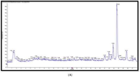 Phenolic acids are usually found in plant extracts. These secondary metabolites have a variety of biological properties, such as anti-inflammatory, hepato-protective, antioxidant, antibacterial, cardioprotective, antidiabetic, anticancer, lung-protective, and neuroprotective properties [35]. Eight peaks were tentatively identified as phenolic acids, specifically chlorogenic acid, trans-cinnamic acid, p-hydroxybenzoic acid, protocatechuic acid, rosmarinic acid, γ-tocotrienol, daphnetin, and caffeic acid. These eight phenolic acids were assigned to Peaks 19, 24, 26, 31, 48, 49, 50, and 55, respectively. They are represented in Figures S24–S29, respectively. Chlorogenic acid had the molecular ion peak [M − H]− at m/z 353.0888 and MS2 fragment ion peaks at m/z 191.0546, corresponding to [C7H11O6]− residue and m/z 173.0496 for additional dehydration [C7H11O6 − H2O]− [36]. P-hydroxybenzoic acid (tr = 3.2552 min, m/z 137.0248, [C7H5O3]−), protocatechuic acid (tr = 4.9513 min, m/z 153.0183 [C7H5O4]−), daphnetin (tr = 8.054 min, m/z 179.1066, [C9H7O4]+), and caffeic acid (tr = 14.1078 min, m/z 179.0549, m/z 179.0549, [C9H7O4]−) all have specific MS2 peaks due to the loss of CO2 [M − H − CO2]− at 93.0341, 109.0297, and 135.0644, respectively [37]. Rosmarinic acid (tr = 7.8473, min, [C18H15O8]−) with the molecular ion m/z 359.0178, has a characteristic MS2 daughter peak at 161.0540 [M − H − C9H9O5 − 2H2O]− [38]. Trans-cinnamic acid (tr = 2.3538 min, [C9H8O2]+), with the molecular ion m/z 149.0598, was identified with specific MS2 peaks at 121.0281 and 65.0367 [16]. Peak No. 49 corresponded to γ-tocotrienol (vitamin E), with the molecular ion m/z 411.1733 and characteristic daughter peaks at 409.8878 and 242.12191 [6].