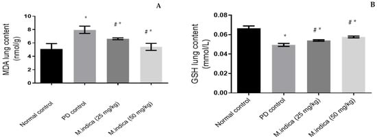 Effect of ME on the lung content of (A) GSH in mmol/L. (B) MDA in nmol/g. Data were expressed as mean ± SD. Statistical analysis was carried out by one-way ANOVA followed by Tukey’s multiple comparisons test. * Significant difference at p < 0.05 when compared to the normal group. # Significant difference at p < 0.05 when compared to the PD group.