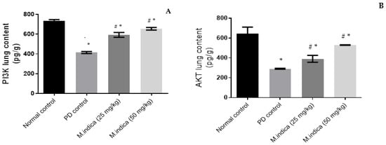 Effect of ME on: (A) Lung content of PI3K in pg/g. (B) Lung content of AKt in pg/g. Data were expressed as mean ± SD. Statistical analysis was carried out by one-way ANOVA followed by Tukey’s multiple comparisons test. * Significant difference at p < 0.05 when compared to the normal group. # Significant difference at p < 0.05 when compared to the PD group.