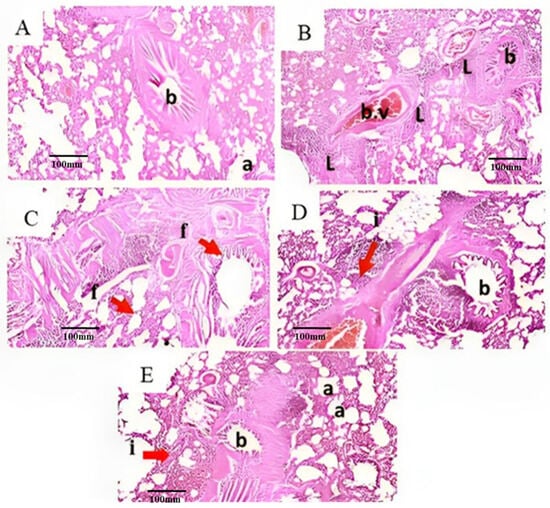 No histopathological alterations were detected, and the normal histological structure of the bronchiole (b) with the surrounding air alveoli (a) were recorded in group of control rats (Figure 4A). The peribronchiolar tissue showed focal lymphoid cells aggregation (L) with dilatation of the blood vessels (b.v) associated with fibroblastic cells (f), and aggregation surrounding the bronchioles as well as in between the obliterated air alveoli in the group of rats experimentally-inducted with PD (Figure 4B,C). The peribronchiolar tissue showed moderate inflammatory cell (i) aggregation in the group of experimentally-inducted rats treated with ME (25 mg/kg) (Figure 4D). However, mild inflammatory cell aggregation was observed in the peribronchiolar tissue, and we found a few lymphoid cell aggregations in the group of experimentally-inducted rats treated with ME (50 mg/kg) Figure 4E. From these histopathological findings, we can conclude that the use of ME at a higher concentration (50 mg/kg) provides better lung protection than that produced by the lower concentration (25 mg/kg). ME reduces the histopathological changes caused by the exposure to PD which might be due to the high content of phenolics and flavonoids. Phenolic and flavonoid compounds have been reported to be able to markedly reduce lung histopathological changes [50].