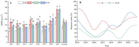 Effects of N and P additions on ANPP (A) and response values (B). CK, control; N, N addition; P, P addition; N + P, N plus P addition. Different lowercase letters represent significant differences among different treatments in the same year at the 0.05 level.