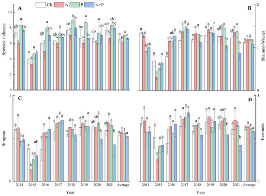 Effects of N and P additions on species richness (A), Shannon–Wiener index (B), Simpson index (C), and evenness (D). The abbreviations of treatments and significant differences among different treatments are the same as in Figure 1.