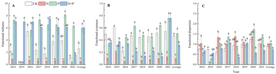 Functional diversity, reflecting the degree of variability in functional traits among species, is a key indicator of biodiversity that has received much attention in recent years. In this study, the N addition significantly decreased functional richness and functional evenness (Figure 3A,B), suggesting that the similarities in functional traits among the species within the community were significant after years of N addition [55]. The intensified competition for resources and the P limitation caused by N addition may contribute to the increase in species competition [48], the reduction in species richness, and the convergence of trait values, leading to a decrease in functional richness. This is consistent with the results of a controlled experiment with multiple levels of N addition in an alpine grassland [56]. In contrast, functional richness was significantly increased under the P and N + P additions (Figure 3A). The increase in functional richness due to the P and N + P additions indicated that the positive effect of plants occupying more functional space in the community was stronger than the negative effect of increasing competition [57,58,59]. Functional diversity is closely related to species ecological niche occupation. The increase in functional diversity after the P addition indicated that the community was more ecologically differentiated and more efficient in its use of resources [60]. On the other hand, after the N + P addition, the functional evenness significantly decreased across the 8 years (p < 0.001) (Figure 3B, Table 2), suggesting that the species’ functional traits were closely distributed.
