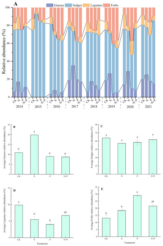 Effects of N and P additions on the relative abundances of four functional groups (A) and on the relative abundances, on average, of grasses (B), sedges (C), legumes (D), and forbs (E). The abbreviations of treatments and significant differences among different treatments are the same as in Figure 1.