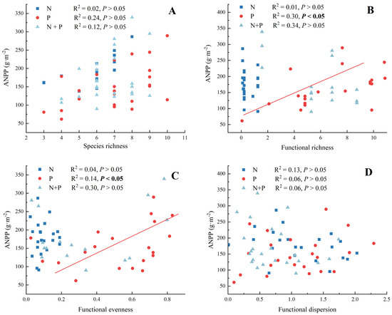 The fitting analysis between species richness (A), functional richness (B), functional evenness (C), functional dispersion (D), and ANPP for N, P, and N + P additions. The abbreviations of treatments and significant differences among different treatments are the same as in Figure 1. Significance are bolded.