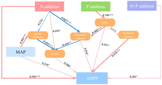 Structural equation modelling to indicate the pathways of the effects of the N, P, and N + P additions on ANPP. Red and blue arrows represent positive and negative pathways, respectively, and solid and dashed lines show significant and non-significant pathways, respectively. The thickness of the arrows indicates the strength of the causal relationship. The final SEM adequately fitted the data: χ2 = 6.164; df = 3; p = 0.104. Significance level: * p < 0.05; ** p < 0.01; *** p < 0.001.