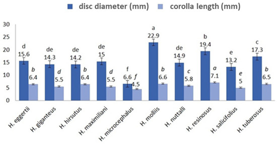Average values of disk diameter and corolla length in the analyzed Helianthus species. Duncan test: values marked with the same letter are not significantly different (the level of significance p ≤ 0.05).