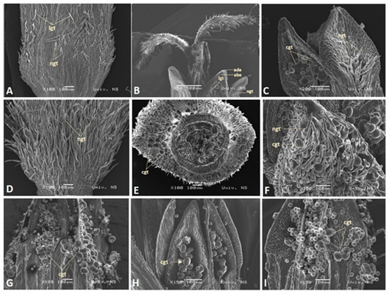 SEM analysis revealed the presence of multicellular, uniseriate, non-glandular trichomes (ngt), as well as multicellular glandular trichomes (capitate—cgt and linear—lgt) on disc florets. The presence, distribution, and abundance of these trichome types are given in Table 1 for each species (Table 1, Figure 2).