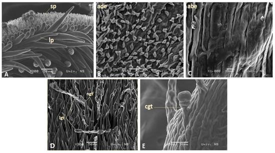 Details of disc florets surface: Stigma lobe (sp—short papile, lp—long papile)—H. microcephalus (A); Adaxial conical epidermal cells (ade)—H. microcephalus (B); Abaxial flat epidermal cells (abe)—H. microcephalus (C); Non-glandular trichomes (ngt) and linear glandular trichomes (lgt)—H. hirsutus (D); Capitate glandular trichomes (cgt)—H. mollis (E).