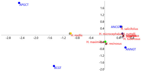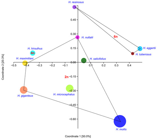 Results of a correspondence analysis (CA), showing the positions of the centroids of the Helianthus species in the space of the first two axes.