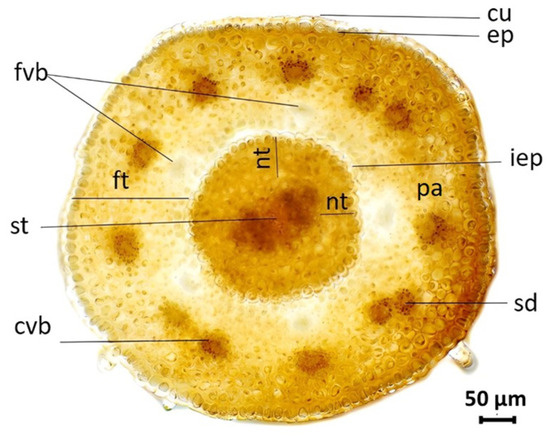 Transverse section through the nectary zone of the disc florets (H. eggertii): cu—cuticle, ep—epidermis, pa—parenchyma, iep—inner epidermis, sd—secretory duct, fvb—filaments vascular bundles, cvb—corolla vascular bundles, st—style, nt—nectary thickness, ft—floral tube.