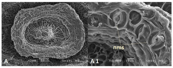 Scanning electron micrographs of nectary surface in H. maximiliani (A). nms—nectary modified stomata (A1).