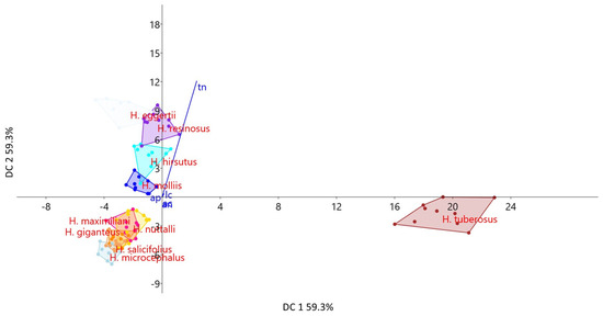 Scatter plot obtained using DCA and the position of centroids in the space of two discriminant axes, based on the disc florets morpho-anatomical characters of the studied Helianthus species.