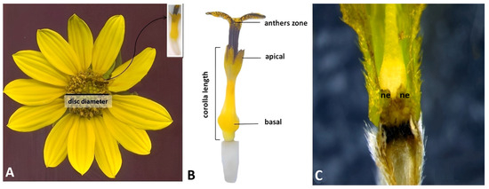 Assessed traits for morphological (A,B) and micro-morphological analysis (B,C) of disc florets (H. eggertii). ne—nectary.