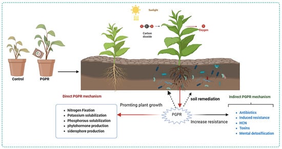 Plant growth and development are intricately linked through mutual interactions between organisms in the root of plants and the rhizosphere. The rhizosphere prevails as a distinct habitat for the majority of microorganisms, serving as a direct source of their nutrients. In particular, bacteria that live around the roots, for example PGPR, are recognized as beneficial bacteria that promote plant growth and regulate plant growth and development. PGPR regulate plant growth and enhance yield via diverse direct action mechanisms, further augmenting plant nutrient assimilation [39]. The mechanisms of the direct action of PGPR encompass nitrogen fixation, the solubilization of phosphorus and potassium minerals, the generation of plant hormones, and the production of ferric iron carriers [40]. Table 2 illustrates the mechanisms by which various beneficial microorganisms regulate crop growth.