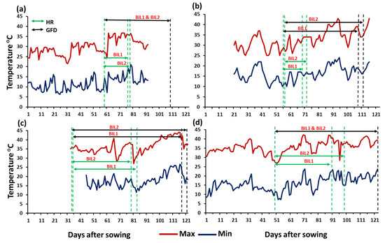 The daily maximum and minimum temperatures recorded during the growing season at (a) Dongola (DN), (b) Waha (WA), (c) Wad Medani first season (WM1), and (d) Wad Medani second season (WM2). The heading ranges (HRs, days) and grain filling duration (GFD, days) of both BIL1 and BIL2 are indicated by the dotted green and black vertical lines, respectively.