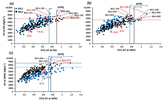 We calculated the two stress tolerance indices (STIs) for GY. The STI1-GY was calculated taking DN as the non-stress environment, whereas the STI2-GY was calculated considering WM2 as a non-stress environment. Then, we performed regression analysis between the GY at DN and the STI1-GY at WA, and the STI1-GY at WM1 (Figure 2a,b). We also performed a regression analysis between the GY at WM2 and the STI2-GY at WM1 (Figure 2c). In BIL1, six genotypes exhibited higher STI values than the recurrent parent, N61, in both WA and WM1 (Figure 2a,b). In BIL2, five genotypes exhibited higher STI and GY values than N61 at WA. At WM1, three genotypes exhibited higher STI and GY values than N61 (Figure 2a,b). For STI2, sixteen and seven genotypes in BIL1 and BIL2, respectively, exhibited higher STI2 values relative to N61 (Figure 2c). Three genotypes in both BILs showed higher GY and STI2 values than N61 (Figure 2c).