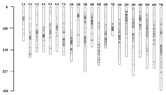 In BIL2, 19,765 markers were used for GRAS-Di genotyping, with 6504 exhibiting polymorphisms between the synthetic wheat donor parent, Syn44, and the recurrent parent, N61. Of these polymorphic markers, 3404 (52.3%) were of high quality, with an average of 162 markers per chromosome. A high-density linkage map was constructed utilizing the 3404 markers spread across 21 linkage groups, covering a total genetic distance of 5673.33 cM (Figure 3 and Table S3). The average distance per chromosome was 270.16 cM. The markers were not uniformly distributed among the chromosomes and subgenomes. Most markers were mapped to the B- (1207, 35.46%) and D- (1201, 35.28%) subgenomes, which had total genetic lengths of 1978.99 and 1943.64 cM, respectively. A total of 996 (29.26%) markers were mapped to the A-subgenome with a total genetic length of 1750.7 cM (Table S3). The B- and D-subgenomes had the highest marker density, with one marker per 1.7 cM, whereas the A-subgenome had one marker per 2.0 cM (Table S3). Chromosome 7D had the highest number of markers (264) with a genetic distance of 435.36 cM, whereas chromosome 5A had the lowest number of markers (69) with a genetic distance of 207.37 cM. Chromosomes 2A, 1B, and 2B had marker gaps greater than 30 cM (Table S4).
