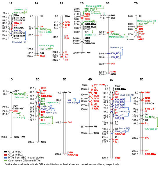 As shown in Figure 4, a number of the QTLs identified in this study were co-located with some of the previously reported QTLs under heat stress conditions on chromosomes 1A, 2A, 2B, 5B, 7B, 1D, and 2D [23,24,37,39,40,41,42,43]. For instance, a number of STI-TKW QTLs were co-localized with previously identified QTLs for HSI-TGW (heat susceptibility index of thousand-grain weight) and TKW under heat and combined heat–drought on chromosomes 1A, 2B, and 2D.