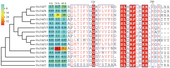 Conserved motifs of OsJAZs and expression patterns of the OsJAZs in response to M. oryzae infection. Full-length protein sequences of 15 OsJAZs were aligned using ClustalW, and a phylogenetic tree was constructed via the NJ method employing MEGA 11.0.11. The heatmap was constructed using Evolview (https://www.evolgenius.info/evolview) accessed on 26 February 2022 to present the expression patterns of 15 OsJAZs genes in the leaves of NPB seedlings inoculated with M. oryzae strain 70-15 at 0, 24, and 48 h. The relative expression levels of the target genes were normalized to the level of the OsActin (n = 3). The expression levels from low to high are indicated by a change in the color from blue to red. These experiments were performed as independent biological repeats with three technical replicates, each yielding similar results.