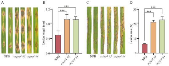 Mutation of OsJAZ4 exacerbates rice’s susceptibility to M. oryzae. (A,B) Disease symptoms and lesion length of 3-week-old seedlings of NPB; osjaz4 wound inoculated with M. oryzae isolate 70-15 at 6 d post-inoculation (dpi) (n = 15 lesions). (C,D) Phenotypes of 2-week-old seedlings of NPB; osjaz4 spray-inoculated with M. oryzae isolate 70-15 at 6 dpi (n = 5 leaves). The lesion lengths and percentage of lesion areas were scored via image analysis using ImageJ 1.52i. Error bars indicate standard deviation (SD). Data were statistically analyzed by one-way ANOVA followed by Dunnett’s multiple comparisons test. The asterisks indicate significant differences (*** p ≤ 0.001). Three independent biological replicates with three technical repeats were tested, each yielding similar results.