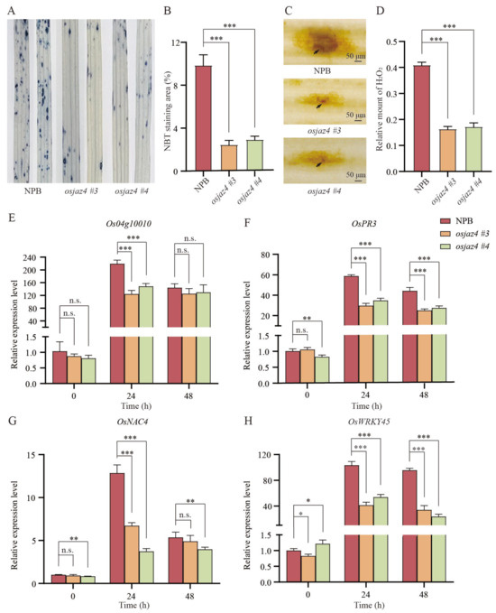 To ascertain whether basal resistance intensifies blast development in osjaz4, we examined several hallmark immune responses, such as the accumulation of reactive oxygen species (ROS) and the expression of defense-related genes. ROS bursts are characteristic features of pattern-triggered immunity (PTI) and effector-triggered immunity (ETI) pathways [36,37]; hence, we evaluated the accumulation of O2− and H2O2 due to the infection of M. oryzae via nitro blue tetrazolium (NBT) staining and 3,3’-diaminobenzidine (DAB) staining, respectively. After NBT staining, the leaf staining area on the osjaz4 leaves was smaller compared to that of NPB, indicating diminished O2- production in osjaz4 compared to the WT plants (Figure 3A,B). DAB staining revealed that osjaz4 produced much smaller amounts of H2O2 than the WT plants in response to rice blast (Figure 3C,D).
