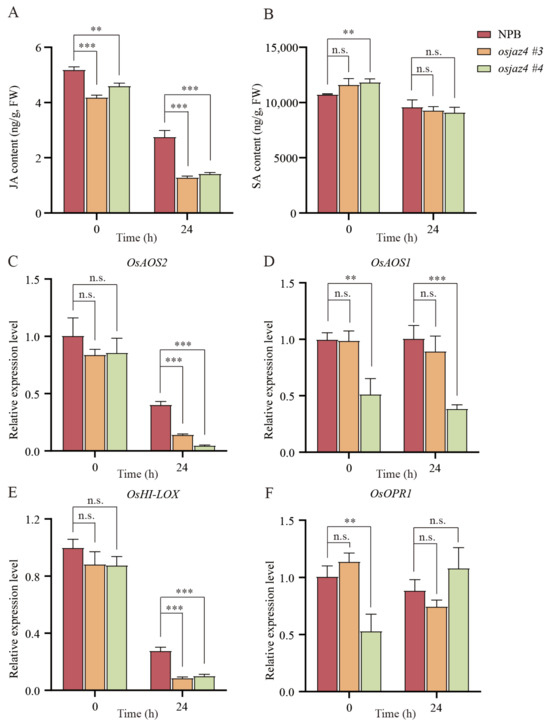 JAZ protein is a pivotal element of the JA signaling pathway [42] and participates in the SA signaling pathway [26]. SA and JA exert crucial roles in modulating plant defense responses [43,44]. To explore the impact of the OsJAZ4 gene knockout on the JA and SA pathways, we assessed the endogenous JA and SA levels in the 2-week-old rice seedlings inoculated with M. oryzae isolate 70-15 at 0 and 24 h. The endogenous JA content in both osjaz4 and the WT plants was low, indicating a decrease in response to M. oryzae infection (Figure 4A). Specifically, the JA content in the osjaz4 plants was significantly lower than that in NPB after rice blast infection. However, the content of endogenous SA in osjaz4 and the WT plants was high, and no significant difference was detected in the SA content between osjaz4 and NPB after 24 h of M. oryzae inoculation (Figure 4B). According to these results, reduced JA accumulation in the osjaz4 lines under normal or M. oryzae-inoculation conditions suggests a potential positive role of OsJAZ4 in the regulation of the JA content.