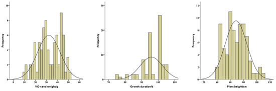 Distributions of 100-seed weight (left), growth duration (middle), and plant height (right) of the total soybean landraces.