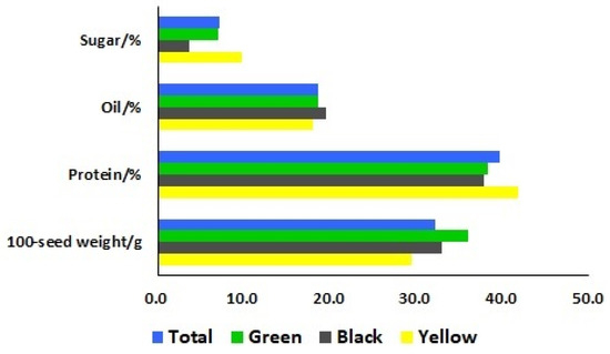 Means of seed sugar, oil, and protein contents and the 100-seed weight of the total soybean landraces, as well as three different seed coat colors (green, black, and yellow).