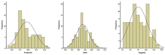 Distributions of the protein (left), oil (middle), and sugar (right) contents of the total soybean landraces.