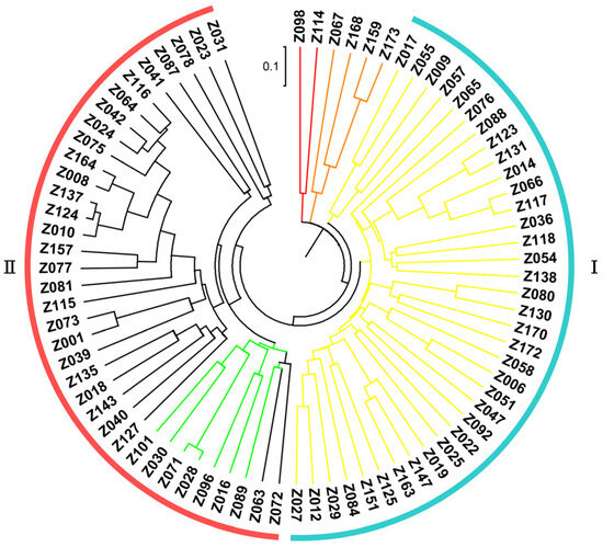 Based upon the genotyping data of 42 SSR markers, the principal component analysis (PCA) showed the relatively close relationships between the landraces, in which the majority were distributed into two sub-populations, although with several outliers (Figure 4). The unweighted pair group method using arithmetic mean cluster analysis further indicated that these soybean landraces could be classified into two groups when combined with the PCA result (Figure 5). These two groups showed a great consistency with the seed coat color. Group I consisted of 36 landraces, and 33 of them had the yellow seed coat. It is interesting to point out that the landraces from group II showed the black or green seed color but has various agronomic performances. Among them, there were seven landraces with the green seed color, often applied as the vegetable type in the locality. In addition, six soybean landraces were recognized as the outliers, including two lines with the green seed coat and four lines with the black seed coat. However, their agronomic performances that we observed were not particular when compared with the other landraces. Hence, more phenotypic identification is needed since these soybean landraces might have a different pedigree and come from other provinces.