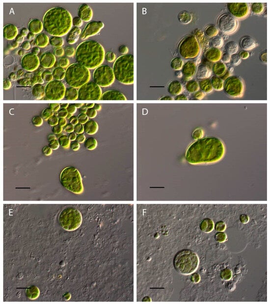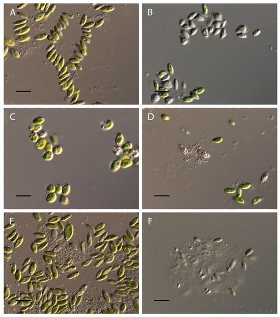 Influence of pH on Vischeria magna morphology. (A) Control variant (pH 6.5); (B) pH 2.5; (C) pH 3; (D) pH 3.5; (E) pH 11.5; (F) pH 12. Scale bar 10 μm.